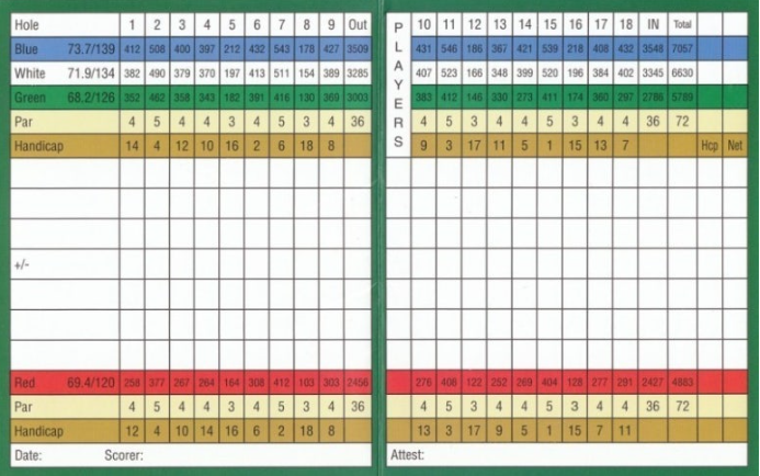 스코어카드는 각 홀에 대한 정보를 담고 있는 지침서라고 할수 있습니다. 보통은 다음과 같은 정보들이 표로 정리되어 있습니다. 먼저 홀 번호입니다. 보통 1번부터 18번까지가 표시되어 있습니다. 그래서 9홀의 코스일 경우에는 1~9번까지만 표기되어 있습니다. 그리고 거리(Yard 또는 Meter)가 표기되어 있습니다. 각 티(백티, 레귤러티, 프론트티)별의 거리입니다. 예를 들어서 화이트티(남성 표준)에서 370m, 레드티(여성 혹은 초보)에서 320m 이런 식으로 적혀있습니다. 그 다음은 파(Par)입니다. 그 해당되는 홀이 드라이버샷부터 해서 몇 번 만에 홀컵에 넣어야 하는지를 기준 타수가 표기되어 있습니다. 그 타수를 그대로 채우면 파, 하나 적은 타수로 넣으면 버디, 넘치면 오버입니다.;Par3라고 한다면 짧은 거리, 즉 한 번에 그린에 올려 퍼팅으로 마무리를 하고,;Par4는 보통 두 번 만에 그린에 올리고 퍼팅으로 홀에 넣고, Par5는 롱홀, 세 번 만에 그린에 올리고 퍼팅으로 그 홀을 마무리 하는 것입니다. 그리고 핸디캡(Handicap)이 있습니다. 이것은 난이도를 나타내는 숫자로서, 1에 가까울수록 그 홀은 코스가 어려운 것입니다. 핸디캡 1번 홀은 보통 가장 까다로운 코스 설계로 되어 있어서, 전략적으로 조심해야 하겠습니다.;스코어카드를 보면 빈 칸이 있는데 여기는 자신의 타수를 직접 적는 공간입니다. 기록을 하면서 “이번 홀은 몇 번 만에 끝냈는지”, “파를 지켰는지”를 체크하게 되는 것입니다. 또, 동반자들의 스코어도 함께 적으면서 경쟁과 재미를 더할 수도 있겠습니다.
